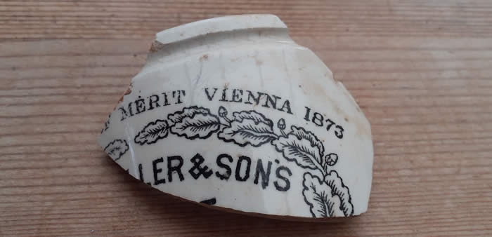 Pottery piece found by Ann on a mole hill on the riverside path (after cleaning). It's from a Keiller's marmalade jar. Date uncertain, presumably late Victorian or early 20th century. The date, 1873, is part of an inscription that should read 'GRAND MEDAL OF MERIT VIENNA 1873', so an award date rather than a manufacturing date.