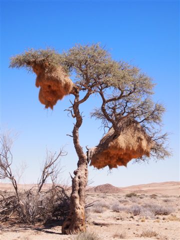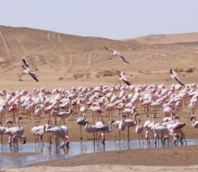 Namibia, September 2013: flamingos; sociable weavers' nests; waterhole with zebras and impala (John Croft).