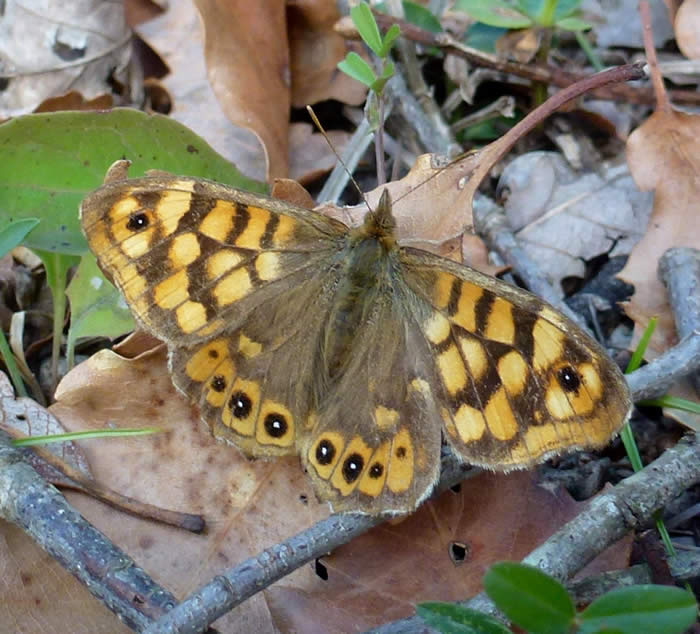 Lemonia philopalus (c/o lepiwiki); southern speckled wood.